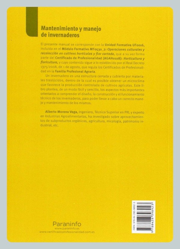Un invernadero es una estructura cerrada y cubierta por materiales traslúcidos, dentro de la cual es posible obtener un microclima que favorece la producción controlada de cultivos agrícolas. Este libro plantea, de un modo fácil y sencillo, los aspectos más importantes orientados a comprender el diseño, la construcción y el funcionamiento técnico de los invernaderos, para poder llevar a cabo un correcto manejo y mantenimiento de los mismos. El presente manual se corresponde con la Unidad Formativa UF0016, incluida en el Módulo Formativo MF0530_2: Operaciones culturales y recolección en cultivos hortícolas y flor cortada, que a su vez forma parte del Certificado de Profesionalidad (AGAH0108): Horticultura y floricultura, y cuyo contenido sigue a lo establecido por el Real Decreto 1375/2008, de 1 de agosto, que regula los Certificados de Profesionalidad en la Familia Profesional Agraria. Alberto Moreno Vega, Ingeniero, Técnico Superior en PRL y experto en Industrias Agroalimentarias, ha investigado sobre aprovechamientos de subproductos orgánicos, agricultura, micología, patrimonio industrial.