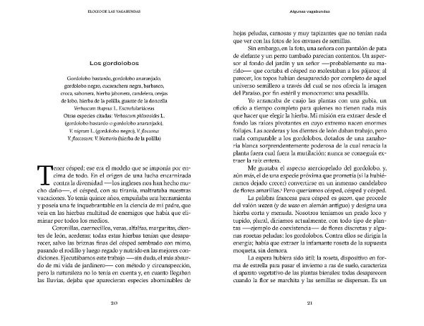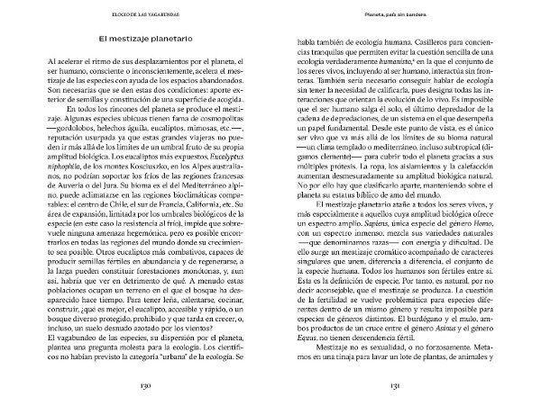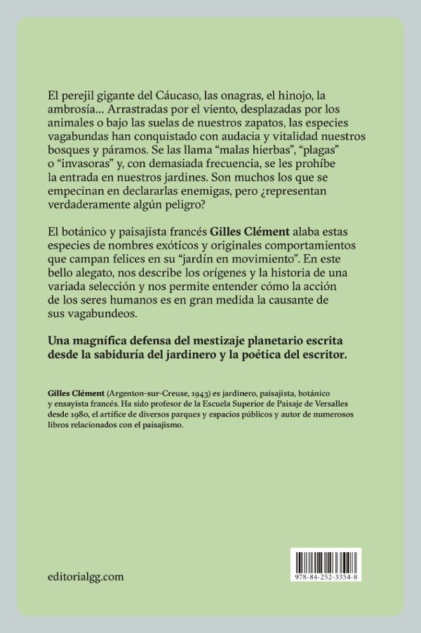 El perejil gigante del Cáucaso, las onagras, el hinojo, la ambrosía arrastradas por el viento, desplazadas por los animales o bajo las suelas de nuestros zapatos, las especies vagabundas han conquistado con audacia y vitalidad nuestros bosques y páramos. Se las llama malas hierbas, plagas o invasoras y, con demasiada frecuencia, se les prohíbe la entrada en nuestros jardines. Son muchos los que se empecinan en declararlas enemigas, pero ¿representan verdaderamente algún peligro? El botánico y paisajista francés Gilles Clément alaba estas especies de nombres exóticos y originales comportamientos que campan felices en su jardín en movimiento. En este bello alegato, nos describe los orígenes y la historia de una variada selección y nos permite entender cómo la acción de los seres humanos es en gran medida la causante de sus vagabundeos. Una magnífica defensa del mestizaje planetario escrita desde la sabiduría del jardinero y la poética del escritor.