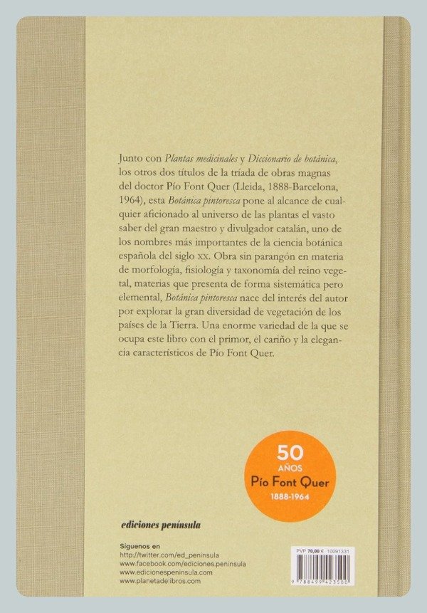 Junto con Plantas medicinales y Diccionario de botánica, los otros dos títulos de la tríada de obras magnas del doctor Pío Font Quer (Lleida, 1888-Barcelona, 1964), esta Botánica pintoresca pone al alcance de cualquier aficionado al universo de las plantas el vasto saber del gran maestro y divulgador catalán, uno de los nombres más importantes de la ciencia botánica española del siglo xx. Obra sin parangón en materia de morfología, fisiología y taxonomía del reino vegetal, materias presentadas de forma sistemática pero elemental, Botánica pintoresca nace del interés del autor por explorar la gran diversidad de vegetación de los países de la Tierra. Una enorme variedad de la que se ocupa este libro con el primor, el cariño y la elegancia característicos de Pío Font Quer.