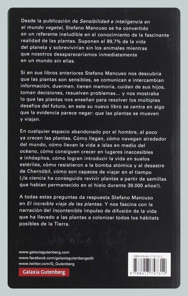 Desde la publicación de Sensibilidad e inteligencia en el mundo vegetal, Stefano Mancuso se ha convertido en un referente ineludible en el conocimiento de la fascinante realidad de las plantas. Suponen el 99,7% de la vida del planeta y sobrevivirían sin los animales mientras que nosotros desapareceríamos inmediatamente en un mundo sin ellas. Si en sus libros anteriores Stefano Mancuso nos descubría que las plantas son sensibles, se comunican e intercambian información, duermen, tienen memoria, cuidan de sus hijos, toman decisiones, resuelven problemas y nos mostraba lo que las plantas nos enseñan para resolver los múltiples desafíos del futuro, en este su nuevo libro se centra en algo que la evidencia parece negar: que las plantas se mueven y viajan. En cualquier espacio abandonado por el hombre, al poco ya crecen las plantas. Cómo llegan, cómo navegan alrededor del mundo, cómo llevan la vida a islas en medio del océano, cómo consiguen crecer en lugares inaccesibles e inhóspitos, cómo logran introducir la vida en suelos estériles, cómo resistieron a la bomba atómica y al desastre de Chernóbil, cómo son capaces de viajar en el tiempo (¡la ciencia ha conseguido revivir plantas a partir de semillas que habían permanecido en el hielo durante 39.000 años!). A todas estas preguntas da respuesta Stefano Mancuso en El increíble viaje de las plantas. Y nos fascina con la narración del incontenible impulso de difusión de la vida que ha llevado a las plantas a colonizar todos los hábitats posibles de la Tierra.