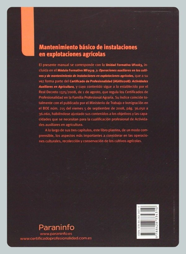 El presente manual se corresponde con la Unidad Formativa UF0163, incluida en el Módulo Formativo MF0519_1: Operaciones auxiliares en los cultivos y de mantenimiento de instalaciones en explotaciones agrícolas, que a su vez forma parte del Certificado de Profesionalidad (AGAX0208): Actividades Auxiliares en Agricultura, y cuyo índice sigue lo establecido por el Real Decreto 1375/2008, de 1 de agosto, que regula los Certificados de Profesionalidad de la Familia Profesional Agraria. A lo largo de sus dos capítulos, este libro plantea, de un modo comprensible, los conocimientos básicos que se necesitan para poder llevar a cabo un correcto mantenimiento de las instalaciones agrarias, establecer en ellas unas medidas de prevención sobre riesgos laborales e integrar la protección medioambiental junto a las actividades agrícolas y agroindustriales. Luis Jiménez Álvarez, Ingeniero Agrícola, Máster en Proyectos y Gestión de Plantas Agroindustriales, ha escrito diversos artículos y libros dedicados a cultivos agrícolas, molinería tradicional, vitivinicultura, etc. Alberto Moreno Vega, Ingeniero, Técnico Superior en PRL y experto en Industrias Agroalimentarias, ha investigado sobre aprovechamientos de subproductos orgánicos, agricultura, micología, patrimonio industrial, etc. María Yolanda López Gálvez, Doctora Ingeniera Agrónoma, es profesora honoraria en la Universidad de Córdoba y autora/coautora de diversas publicaciones que tratan sobre agricultura e industrias agroalimentarias: aloe vera, olivicultura, enología, elaiotecnia, etc.