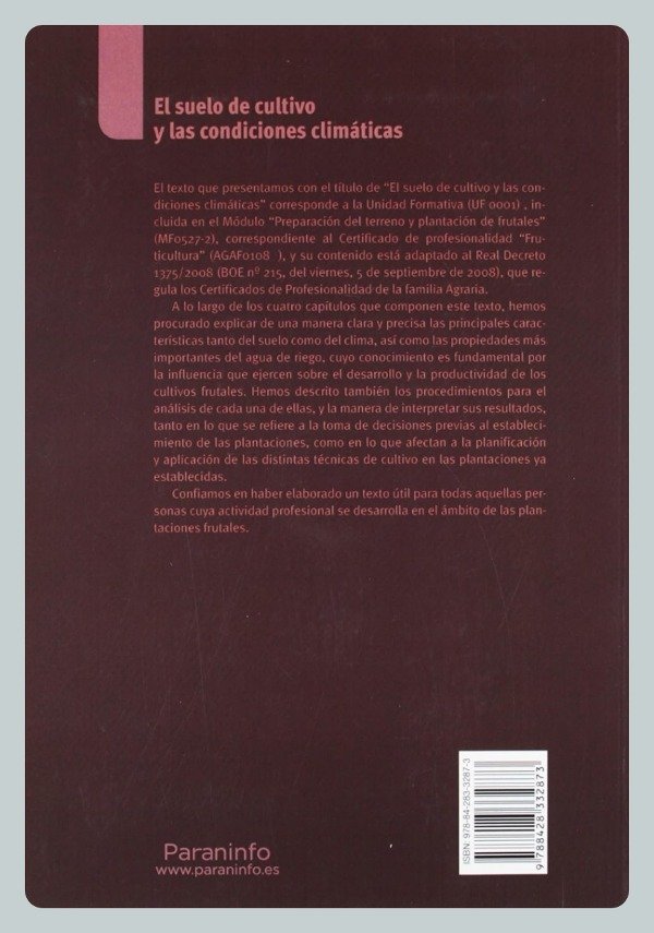 El texto que presentamos con el título de El suelo de cultivo y las condiciones climáticas corresponde a la Unidad Formativa (UF 0001), incluida en distintos Módulos Fomativos y, a su vez, forma parte de varios Certificados de Profesionalidad (AGAF0108, AGAH0108, AGAC0108), y su contenido está adaptado al Real Decreto 1375/2008 (BOE nº 215, del viernes, 5 de septiembre de 2008), que regula los Certificados de Profesionalidad de la familia Agraria. A lo largo de los cuatro capítulos que componen este texto, hemos procurado explicar de una manera clara y precisa las principales características tanto del suelo como del clima, así como las propiedades más importantes del agua de riego, cuyo conocimiento es fundamental por la influencia que ejercen sobre el desarrollo y la productividad de los cultivos frutales. Hemos descrito también los procedimientos para el análisis de cada una de ellas, y la manera de interpretar sus resultados, tanto en lo que se refiere a la toma de decisiones previas al establecimiento de las plantaciones, como en lo que afectan a la planificación y aplicación de las distintas técnicas de cultivo en las plantaciones ya establecidas. Confiamos en haber elaborado un texto útil para todas aquellas personas cuya actividad profesional se desarrolla en el ámbito de las plantaciones frutales. Raquel Casas Flores es Doctora Ingeniero Agrónomo y profesora de Fruticultura en la Escuela Técnica Superior de Ingenieros Agrónomos de la Universidad Politécnica de Madrid.