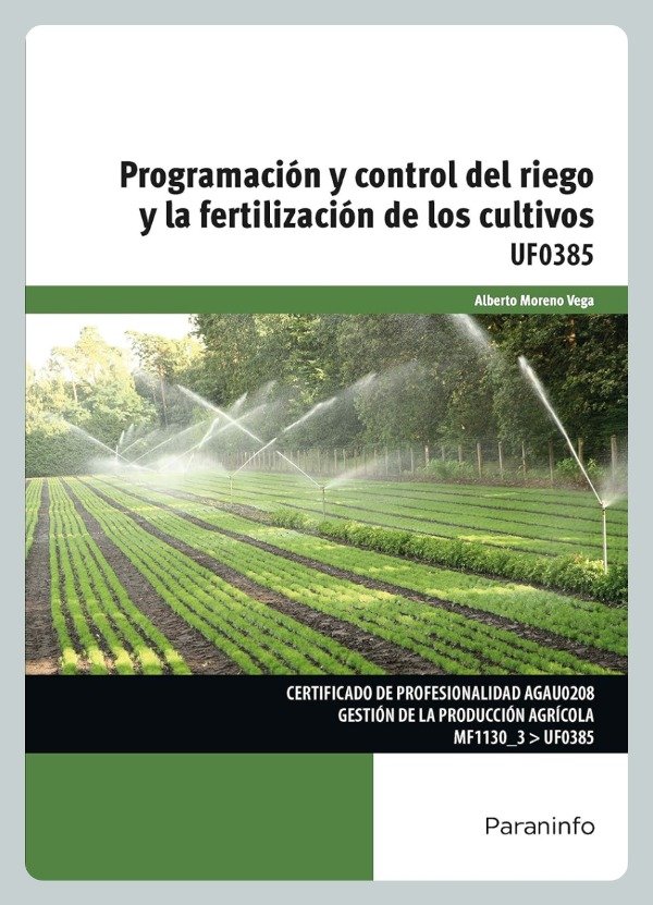 El presente manual se corresponde con la Unidad Formativa Programación y control del riego y la fertilización de los cultivos (código UF0385), con una duración de 70 horas. Está incluida en el Módulo Formativo Organización y control de las operaciones de cultivo (MF1130_3), correspondiente al Certificado de Profesionalidad AGAU0208 Gestión de la producción agrícola, que forma parte de la Familia Profesional Agraria. A lo largo de sus cuatro capítulos, este libro plantea, de un modo asequible para cualquier lector interesado en esta materia, los aspectos más importantes a considerar sobre la programación y el control del riego y de la fertilización de los cultivos agrícolas. Se analizan las condiciones edáfico-agronómicas necesarias para el correcto crecimiento y desarrollo de las plantas, explicando tanto las necesidades hídricas y de abonado de los cultivos agrícolas, como también el control y la programación de las instalaciones de riego y de las operaciones de fertilización. Asimismo, se estudian los costes para poder tomar las mejores decisiones de rentabilidad y valoración económica, tanto en las infraestructuras de irrigación como en las actividades de abonado. Finalmente, se aplican las medidas de protección medioambiental y de prevención de riesgos laborales más adecuadas en el riego y la fertilización de los cultivos agrícolas. Alberto Moreno Vega está titulado en distintas ramas de la ingeniería, es Técnico Superior y Especialista Universitario en PRL. Ha escrito numerosos artículos y libros técnico-didácticos dedicados a la ingeniería rural, cultivos agrícolas e industrias agroalimentarias. Desde hace más de diez años desarrolla su actividad profesional como empleado público de la Junta de Andalucía.