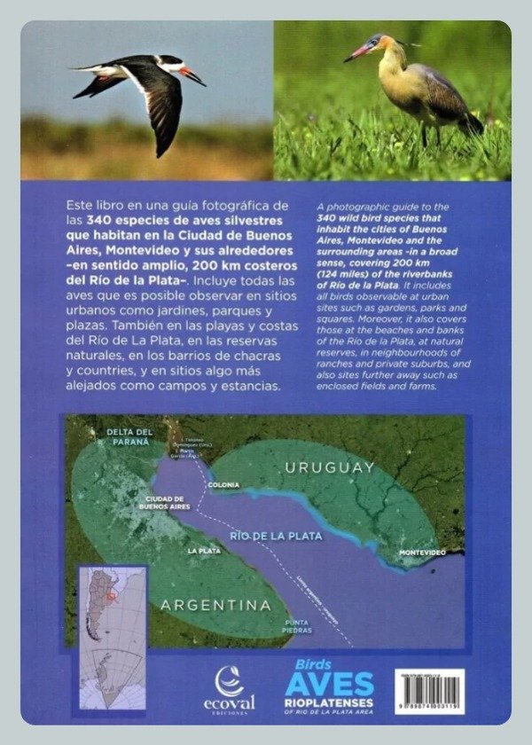 Una guía fotográfica de las 340 especies de aves silvestres que habitan en la ciudad de Buenos Aires, Montevideo y sus alrededores -en sentido amplio, 200 km. costeros del Río de la Plata. Incluye todas las aves que es posible observar en sitio urbanos como jardines, parques y plazas. También en las playas y costas del Río de la Plata, en las reservas naturales, en los barrios de chacras y countries, y en sitios algo más alejados como campos y estancias.