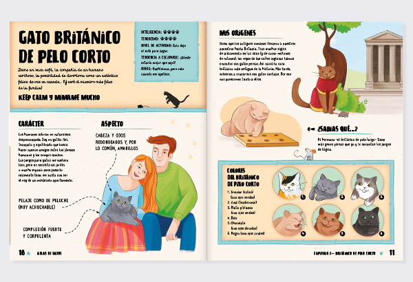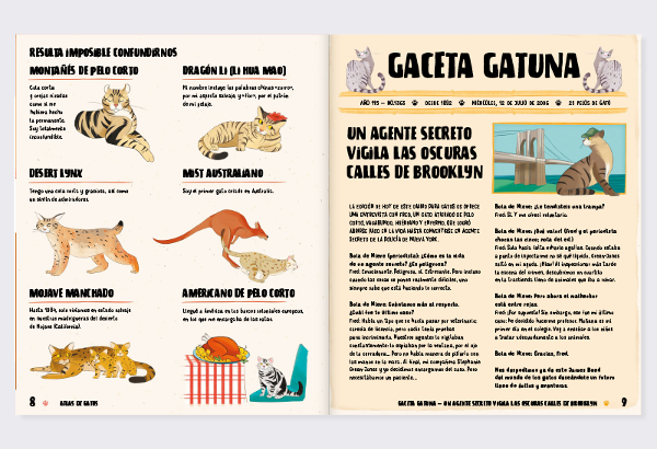 ¿Sabías que algunos gatos no tienen cinco dedos, sino seis? No te estoy tomando el pelo, ¡Es cierto! Da igual si ya tienes uno de éstos adorables animalitos en casa o si solamente te gustan, en estas páginas descubrirás las razas de gatos más interesantes, vagas, cariñosas y salvajes del mundo, desde el gato común europeo al gato persa, de sedoso pelaje, pasando por el poco frecuente lykoi. Y si te gusta tener una buena historia antes de dormir, podrás disfrutar en la cama con Gaceta Gatuna, un periódico sobre gatos que encontrarás en este atlas.
