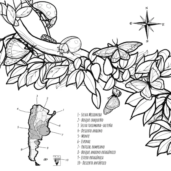 Este libro contiene 10 láminas de cada uno de los biomas de Argentina con referencias en su parte posterior, nombre de cada especie, y remarcadas en color gris, las especies en peligro de extinción, la mayoría debido a: