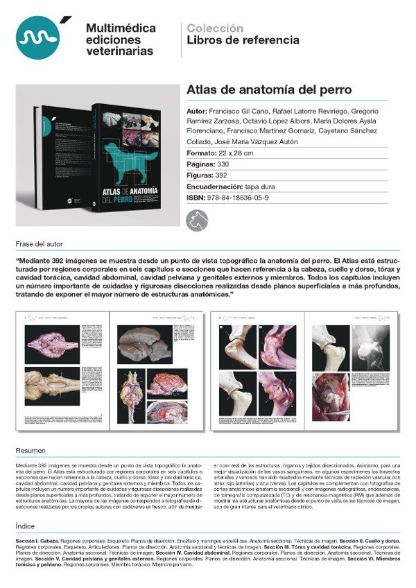 Mediante 392 imágenes se muestra desde un punto de vista topográfico la anatomía del perro. El Atlas está estructurado por regiones corporales en seis capítulos o secciones que hacen referencia a la cabeza, cuello y dorso, tórax y cavidad torácica, cavidad abdominal, cavidad pelviana y genitales externos y miembros. Todos los capítulos incluyen un número importante de cuidadas y rigurosas disecciones realizadas desde planos superficiales a más profundos, tratando de exponer el mayor número de estructuras anatómicas. La mayoría de las imágenes corresponden a fotografías de disecciones realizadas por los propios autores con cadáveres en fresco, a fin de mostrar el color real de las estructuras, órganos y tejidos diseccionados. Asimismo, para una mejor visualización de los vasos sanguíneos, en algunos especímenes los trayectos arteriales y venosos han sido resaltados mediante técnicas de repleción vascular con látex rojo (arterias) y azul (venas). Los capítulos se complementan con fotografías de cortes anatómicos (anatomía seccional) y con imágenes radiográficas, endoscópicas, de tomografía computarizada (TC) y de resonancia magnética (RM) que además de mostrar las estructuras anatómicas desde el punto de vista de las técnicas de imagen, son de gran interés para el veterinario clínico.