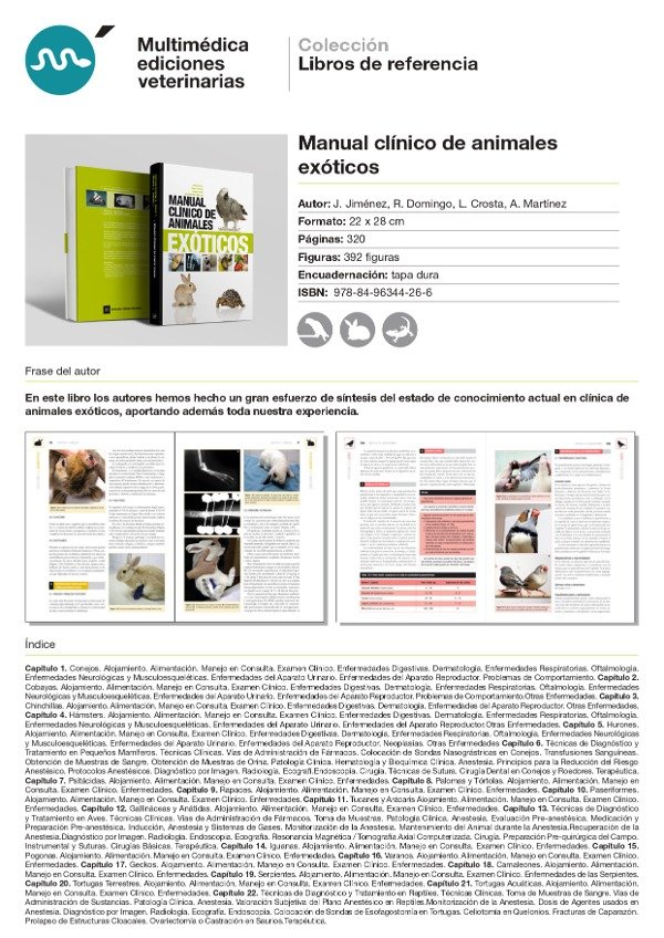 Este manual presenta una síntesis en profundidad del estado de conocimiento actual en clínica de animales exóticos, proporcionando al clínico toda la información básica necesaria para alcanzar un nivel avanzado en la práctica diaria.