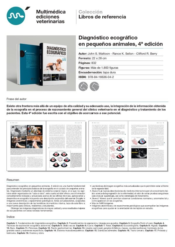 Diagnóstico ecográfico en pequeños animales, 4 edición es una fuente fundamental para entender los principios básicos de la ecografía en el cuidado de pequeños animales. Organizado mediante un abordaje de sistema corporal lógico, en el que los capítulos están organizados de “cabo a rabo”, esta cuarta edición ofrece una información completamente revisada y actualizada acerca de las últimas técnicas, aplicaciones y desarrollos en ecografía incluyendo una descripción expandida del examen Doppler e imágenes anatómicas y especimenes patológicos. Estas actualizaciones, acopladas a una nueva descripción de las temáticas de medicina interna, hace de este libro la mejor fuente para clínicos, residentes y estudiantes.