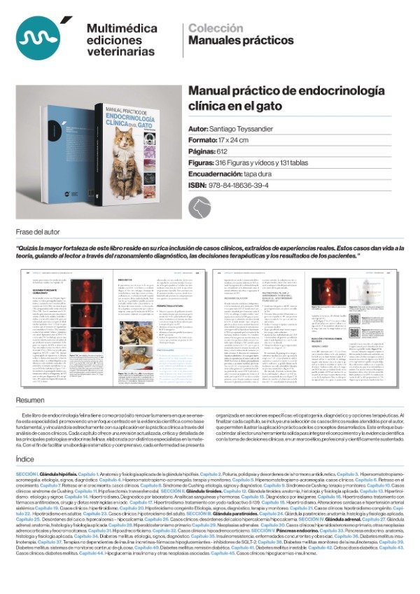 Este libro de endocrinología felina tiene como propósito renovar la manera en que se enseña esta especialidad, promoviendo un enfoque centrado en la evidencia científica como base fundamental, y vinculándola estrechamente con su aplicación en la práctica clínica a través del análisis de casos clínicos. Cada capítulo ofrece una revisión actualizada, crítica y detallada de las principales patologías endocrinas felinas, elaborada por distintos especialistas en la materia.