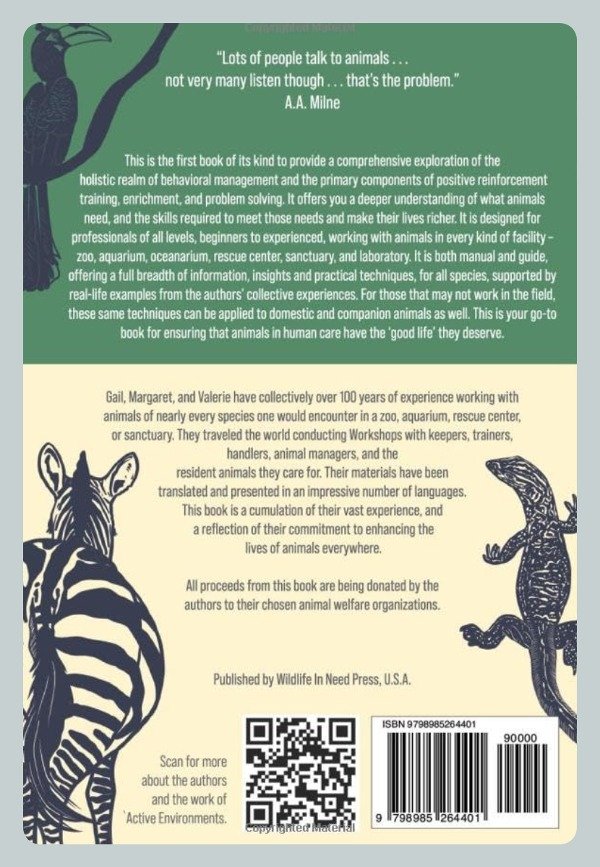 The authors Gail Laule, Margaret Whittaker, and Valerie Hare have collectively over 100 years of experience working with a vast array of animals and species, including mammals, birds, reptiles, and fish. They have spent those years travelling the world conducting Workshops with keepers, trainers, handlers, animal managers, and the resident animals they care for. Their materials have been translated and presented in an impressive number of languages. This book is a cumulation of their vast experience, and a reflection of their commitment to enhancing the lives of animals everywhere.