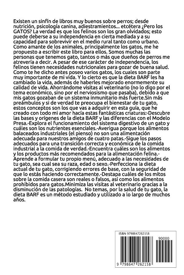 Existen un sinfín de libros muy buenos sobre perros; desde nutrición, psicología canina, adiestramientos... etcétera ¿Pero los GATOS? La verdad es que los felinos son los gran olvidados; esto puede deberse a su independencia en cierta mediada y a su capacidad para sobrevivir en el medio rural tanto como urbano. Como amante de los animales, principalmente los gatos, me he propuesto a escribir este libro para ellos. Somos muchas las personas que tenemos gato, tantos o más que dueños de perros me atrevería a decir. A pesar de ese carácter de independencia, los felinos tienen necesidades nutricionales para gozar de buena salud. Como te he dicho antes poseo varios gatos, los cuales son parte muy importante de mi vida. Y lo cierto es que la dieta BARF les ha cambiado la vida, además de haberles mejorado enormemente su calidad de vida. Ahorrándome visitas al veterinario (no lo digo por el tema económico, sino por el nerviosismo que pasaba), debido a que mis gatos gozaban de un sistema inmunitario más fuerte.Sin más preámbulos y si de verdad te preocupa el bienestar de tu gato, estos conceptos son los que vas a adquirir en esta guía, que he creado con todo mi amor hacía estas fantásticas criaturas: -Descubre las bases y orígenes de la dieta BARF y las diferencias con el Modelo Presa.-Explora el funcionamiento del sistema digestivo de un gato y cuáles son los nutrientes esenciales.-Averigua porque los alimentos balaceados industriales (el pienso) no son una alimentación adecuada para nuestros amigos de cuatro patas.-Sigue los pasos adecuados para una transición correcta y económica de la comida industrial a la comida de verdad.-Encuentra cuáles son los alimentos y los productos más recomendados para la alimentación felina. -Aprende a formular tu propio menú, adecuado a las necesidades de tu gato, sea cual sea su raza, edad o sexo.-Perfecciona la dieta actual de tu gato, corrigiendo errores de base, con la seguridad de que lo estás haciendo correctamente. -Destapa cuáles de los mitos sobre la comida casera son reales o falsos, así como los alimentos prohibidos para gatos.Minimiza las visitas al veterinario gracias a la disminución de las patologías. No temas, por la salud de tu gato, la dieta BARF es un método estudiado y utilizado a lo largo de muchos años.