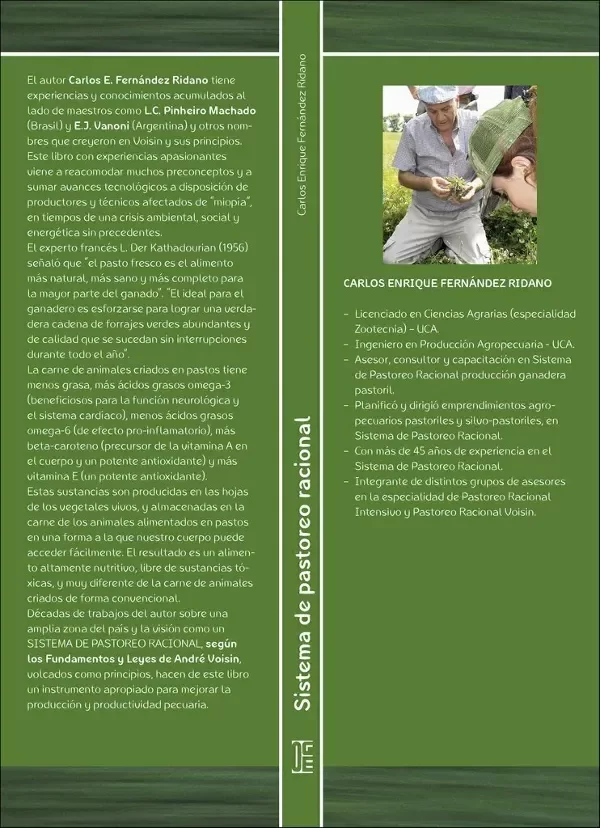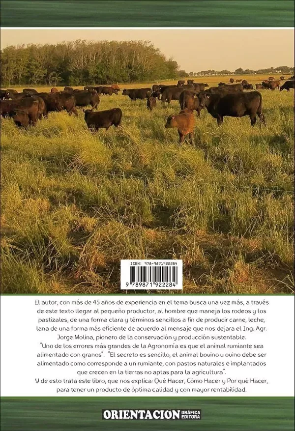 El autor con mas de 45 anos de experiencia en el tema busca una vez mas, a través de este texto llegar al pequeño productor, al hombre que maneja los rodeos y los pastizales, de una forma clara y términos sencillos a fin de producir carne, leche, lana de una forma eficiente de acuerdo al mensaje que nos dejara el Ing. Agr. Jorge Molina, pionero de la conservación y producción sustentable.