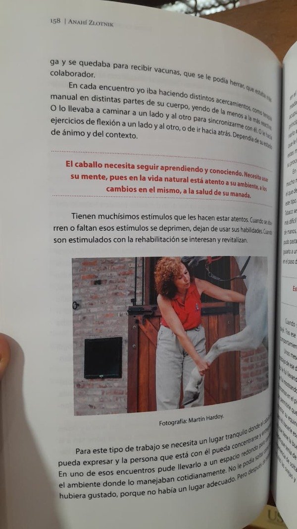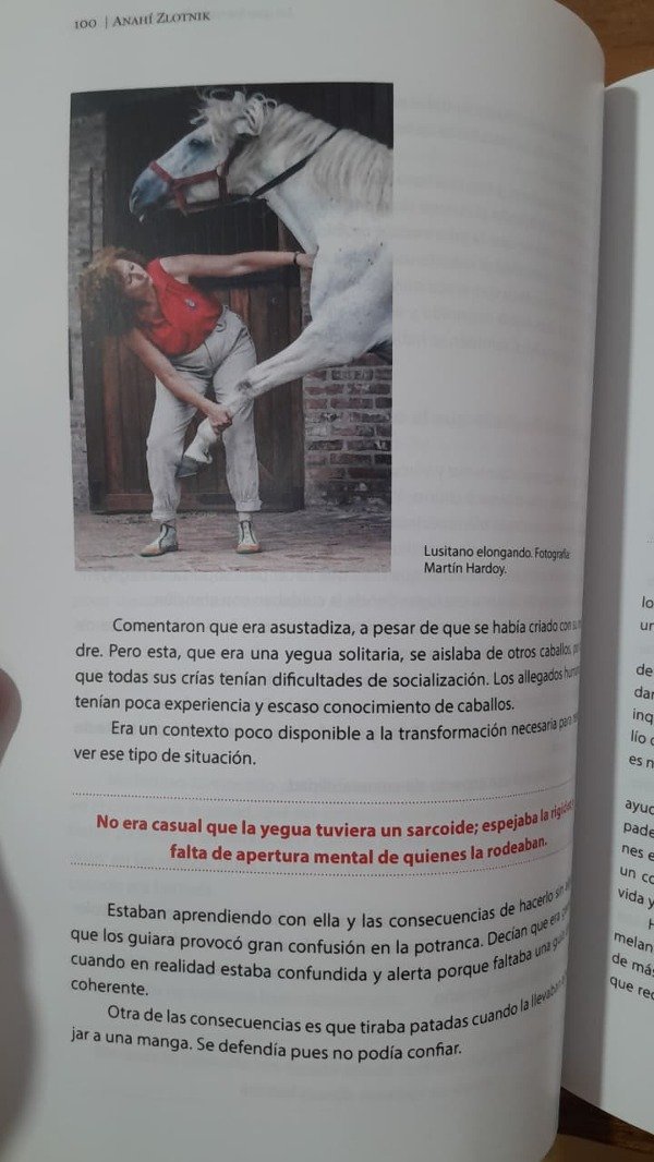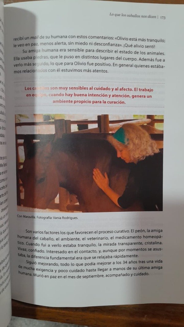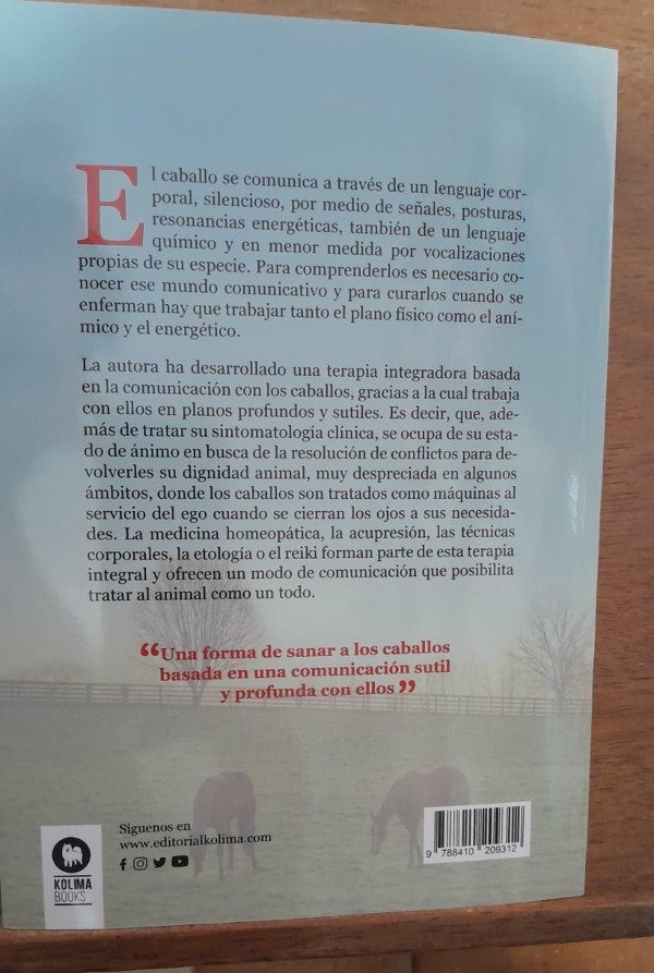 El caballo se comunica a través de un lenguaje corporal, silencioso, por medio de señales, posturas, resonancias energéticas, también de un lenguaje químico y en menor medida por vocalizaciones propias de su especie. Para comprenderlos es necesario conocer ese mundo comunicativo y para curarlos cuando se enferman hay que trabajar tanto el plano físico como el anímico y el energético. La autora ha desarrollado una terapia integradora basada en la comunicación con el caballo, gracias a la cual trabaja con ellos en planos profundos y sutiles. Es decir, que, además de tratar su sintomatología clínica, trabaja con su estado de ánimo en busca de la resolución de conflictos para devolverles su dignidad animal, muy despreciada en algunos ámbitos, donde los caballos son tratados como máquinas al servicio del ego cuando se cierran los ojos a sus necesidades. La medicina homeopática, la acupresión, las técnicas corporales, la etología o el reiki forman parte de esta terapia integral y ofrecen un modo de comunicación que posibilita tratar al animal como un todo.